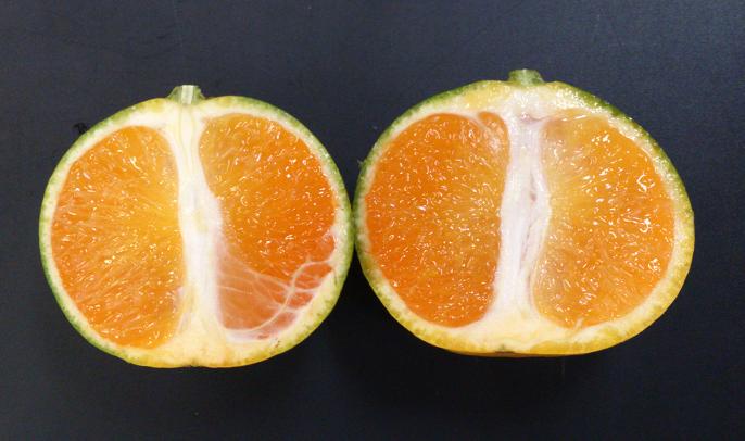○果形が丸いのが特徴です。 ○果皮に緑が残っていても、果肉は立派なみかん色です。 |