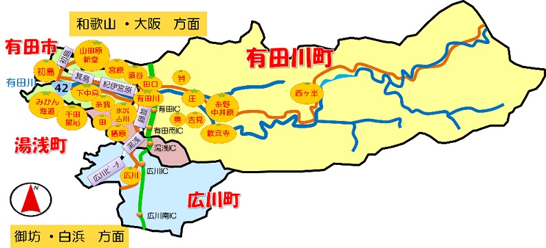 有田地方は、和歌山県の中部に位置し、年平均気温16℃、年間降水量1,600mm~1,700mmと、比較的温暖な気候を活かし、古くからみかん栽培が行われています。 みかん栽培は400年の歴史を持ち、「有田みかん」として名を馳せており、海岸地帯から標高300m近い所にかけて、全国屈指の柑橘地帯を形成しています。 このページでは、複雑な地形の有田地域での柑橘栽培の様子を紹介します。 |
