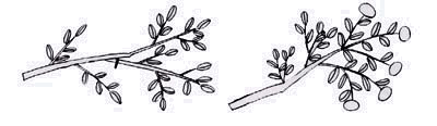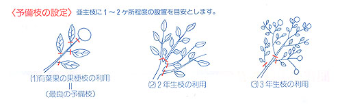 | 表年の樹は・・・ | 夏秋梢の切除と予備枝の設定で新梢の発生を促しましょう。 |