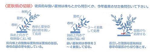 | 裏年の樹は・・・ | 切り返しを控え、間引き剪定により、できるだけ母枝を残してください。 極端に着花不良が予想される樹は、発芽状態を見て4月以降新梢を制限し、充実した母枝を作ってください。 |