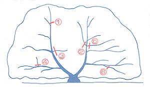 剪定の基本はかわりません ①樹高を下げる ②主枝との競合枝を間引く ③内向枝を除く ④立枝を間引く ⑤重なり枝を除く ⑥下垂枝を除く ⑦枯枝を除く |